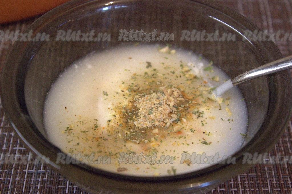 В отдельной миске соединить сметану, влить воду комнатной температуры, посолить, приправить специями по вкусу (из специй я добавила по одной чайной ложке сушёной зелени, универсальную приправу для грибов и сушёный чеснок), получившийся соус тщательно перемешать.