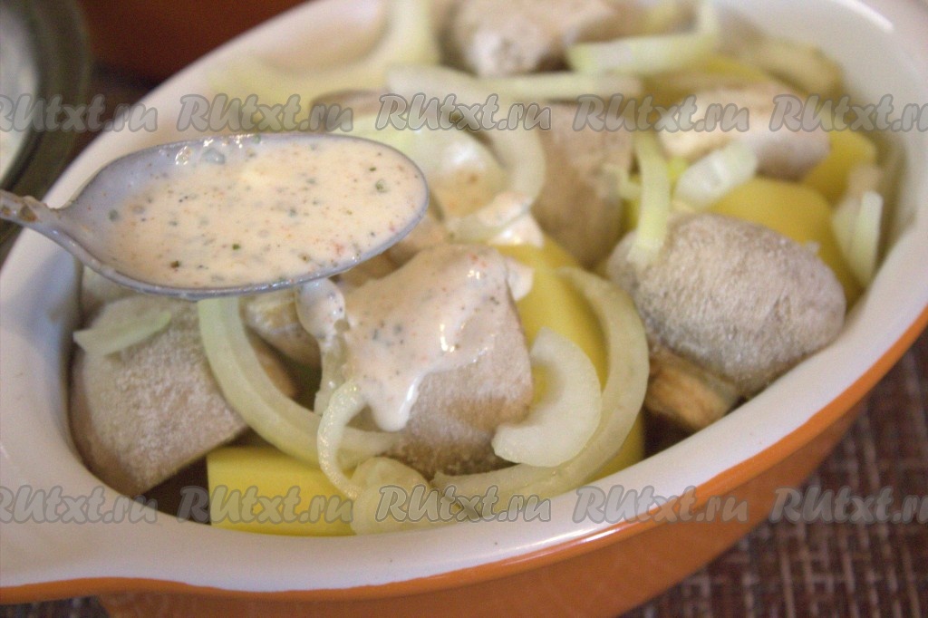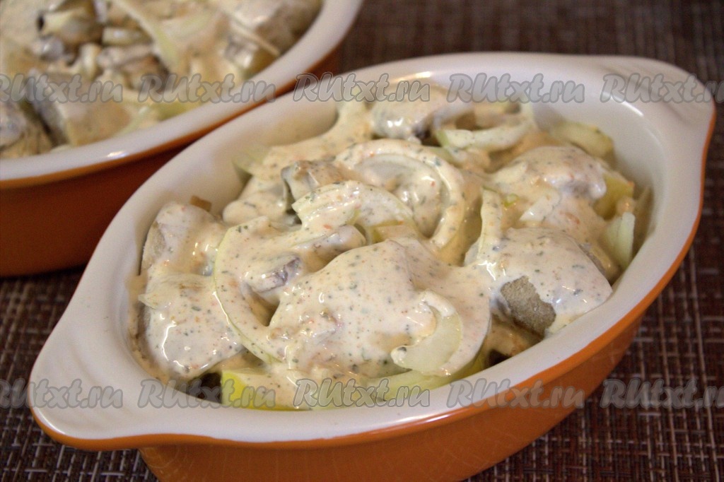 Залить получившимся сметанным соусом картошку и шампиньоны.