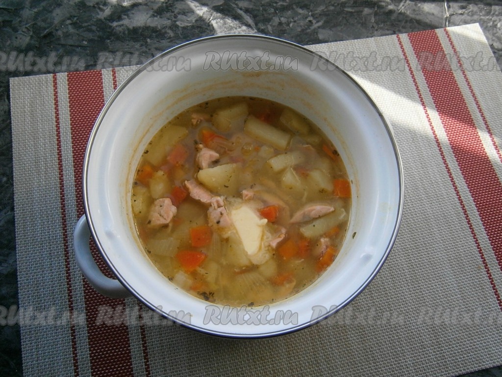 Варить суп с сёмгой ещё 10 минут. Добавить кусочек сливочного масла, дать ему расплавиться.