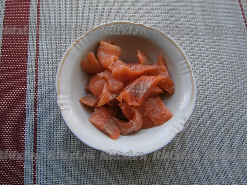 Филе сёмги (если рыба заморожена, заранее разморозьте её) нарезать на небольшие кусочки.