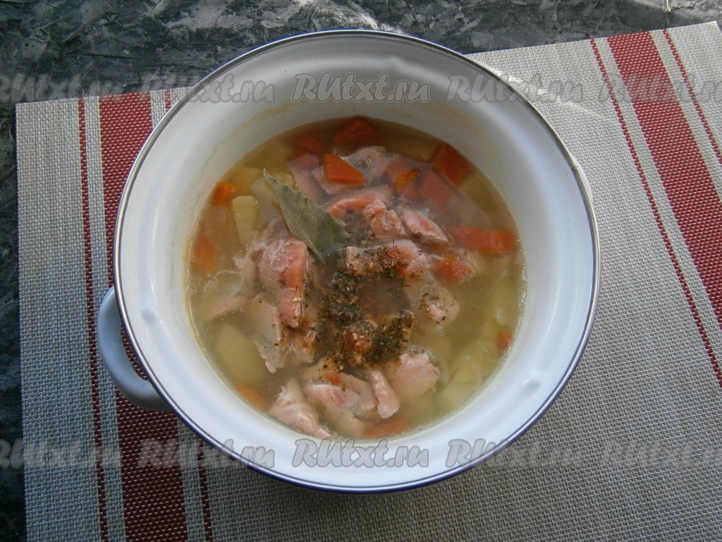 Залить нарезанные овощи водой, поставить кастрюлю на огонь, довести до кипения. Воду посолить и, прикрыв кастрюлю крышкой, варить овощи на небольшом огне около 20 минут. Затем в кастрюлю выложить кусочки сёмги, добавить специи, сушёную зелень и лавровый листик, дать закипеть и уменьшить огонь.