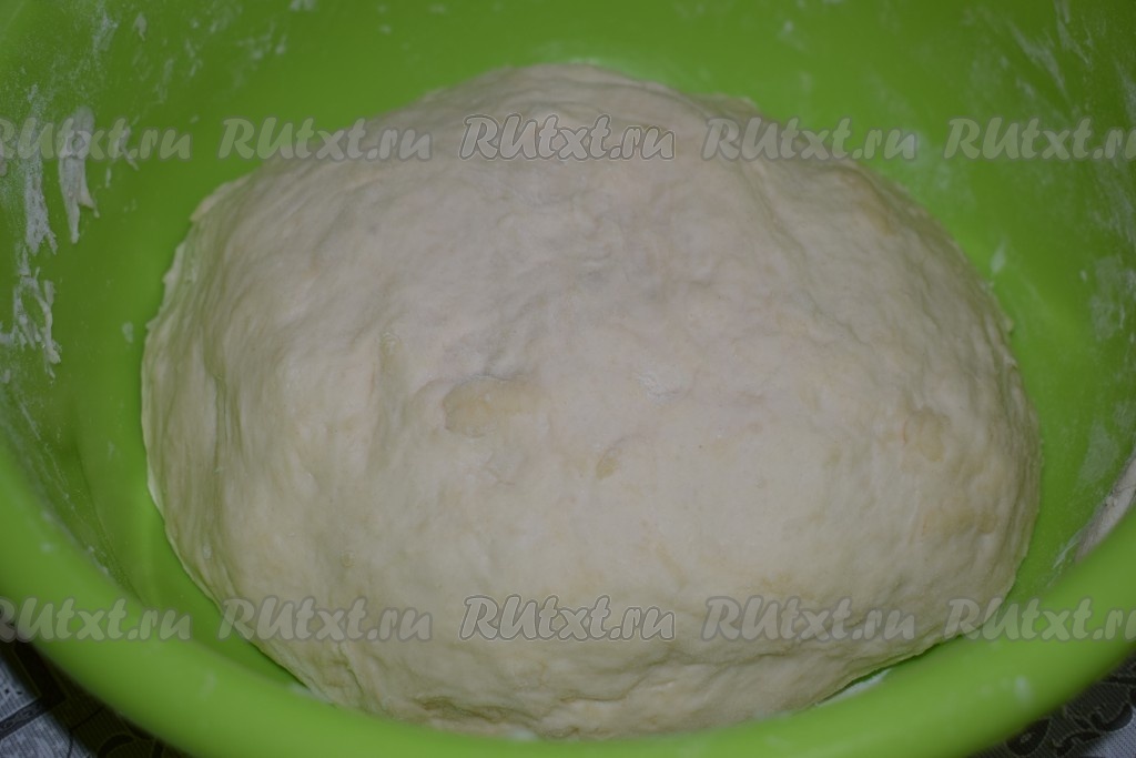 Замешиваем тесто вначале ложкой, а затем - руками. Для того чтобы тесто не забивать лишней мукой при замесе, нужно смазать руки растительным маслом. Тесто быстро скатывается в шар и перестаёт липнуть к рукам. Вымешиваем тесто руками минут 10. По консистенции оно получается нежным, гладким и лёгким, слегка упругим.