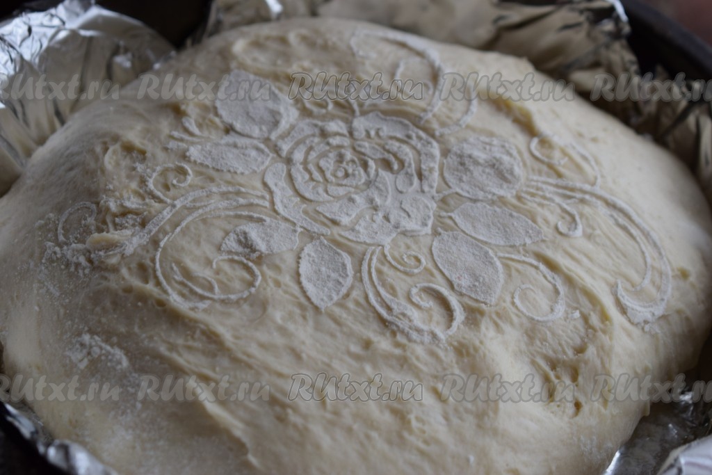 Оставляем хлеб расстояться ещё на полчаса. Далее я украсила свой хлебушек при помощи трафарета с рисунком и муки. На хлеб положила трафарет, посыпала сверху мукой и немного потёрла рукой, чтобы мука впечаталась в поверхность хлеба.