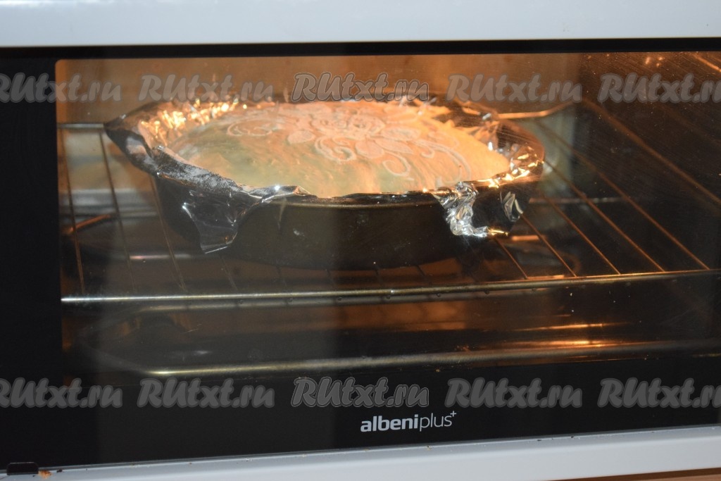 Обминаем тесто, округляем его и перекладываем в форму для выпекания, которую предварительно необходимо застелить фольгой (или пергаментом). Для выпечки берём форму диаметром 24 см.