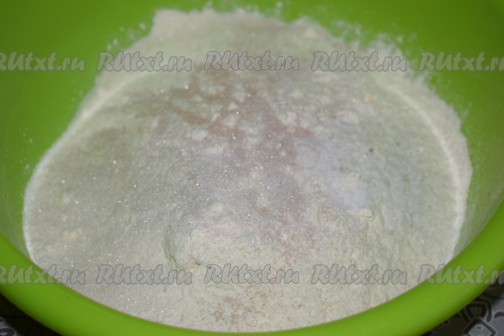 Вначале замесим тесто, для этого насыпаем в глубокую миску муку, сахар, соль, сухие дрожжи и хорошо перемешиваем мучную смесь.