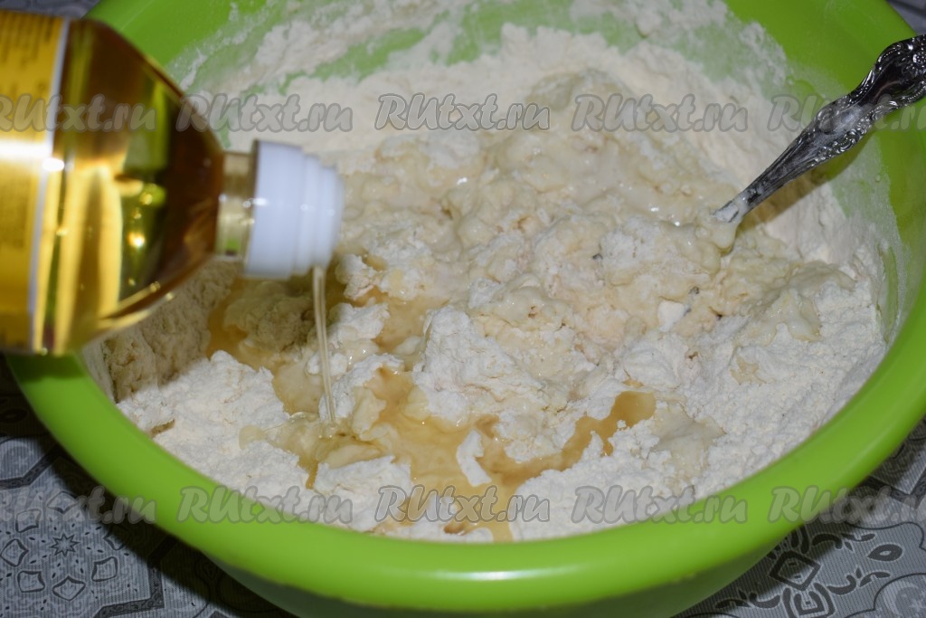 В миску с мучной смесью вливаем кефир с водой и добавляем растительное масло.
