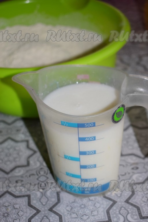 В отдельной ёмкости смешиваем кефир и кипячёную тёплую воду, смесь должна получиться достаточно тёплой, но её температура не должна превышать 40 градусов.