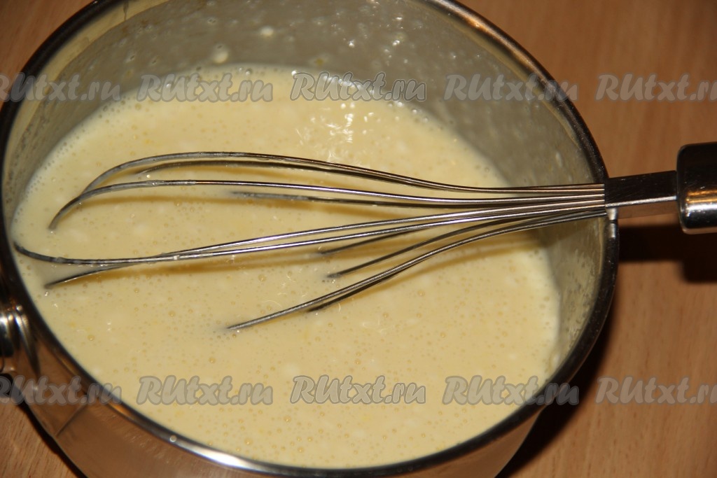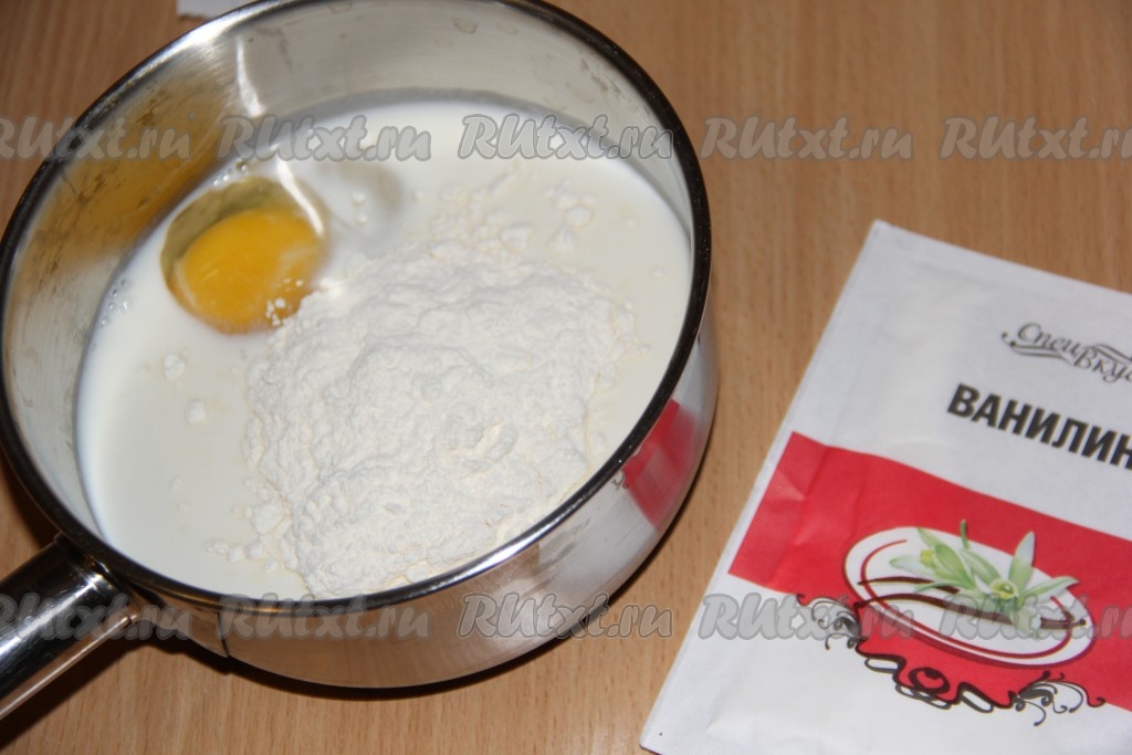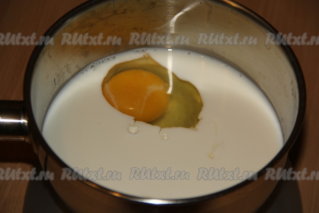 Для начала приготовим заварной крем, для этого в сотейник (или толстостенную кастрюлю) нужно влить молоко, добавить яйцо.
