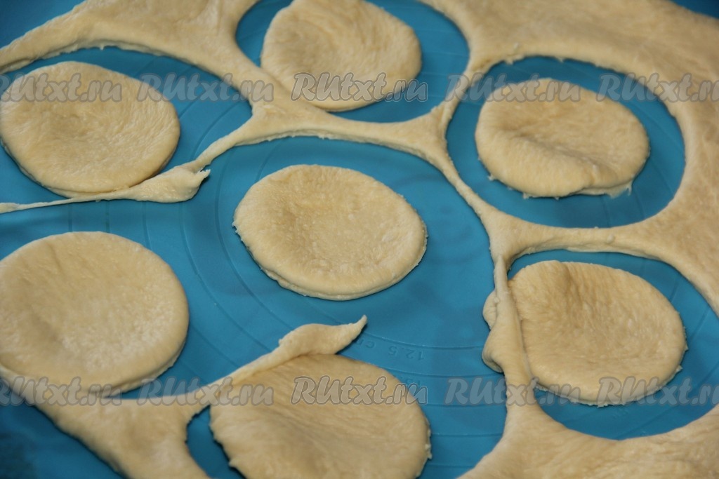 Тесто на столе (или на силиконовом коврике), чуть припылённом мукой, раскатать в достаточно тонкий пласт и с помощью стакана вырезать кружочки (у меня получилось 17 кружочков).