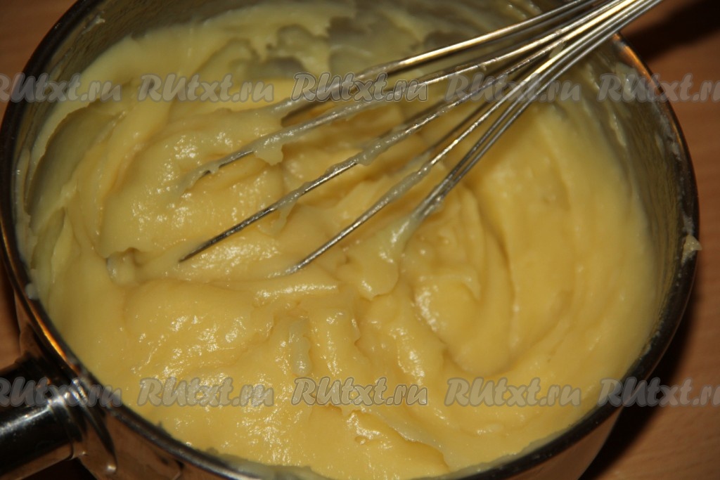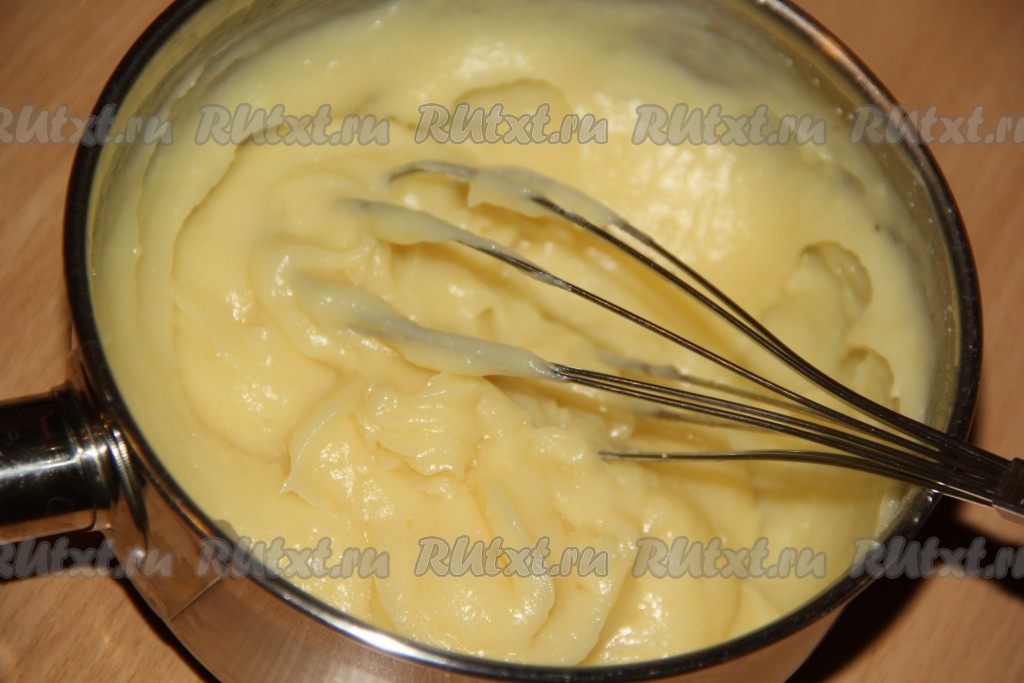 Варить заварной крем, постоянно помешивая, на среднем огне до закипания, затем дать провариться ещё пару минут (до загустения), не переставая помешивать. Загустевший крем снять с огня.