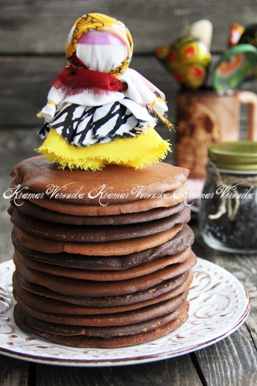 Вот такая аппетитная высокая горка панкейков, замешанных на молоке с какао, у меня получилась, полить их шоколадом или сгущёнкой и подать к столу.