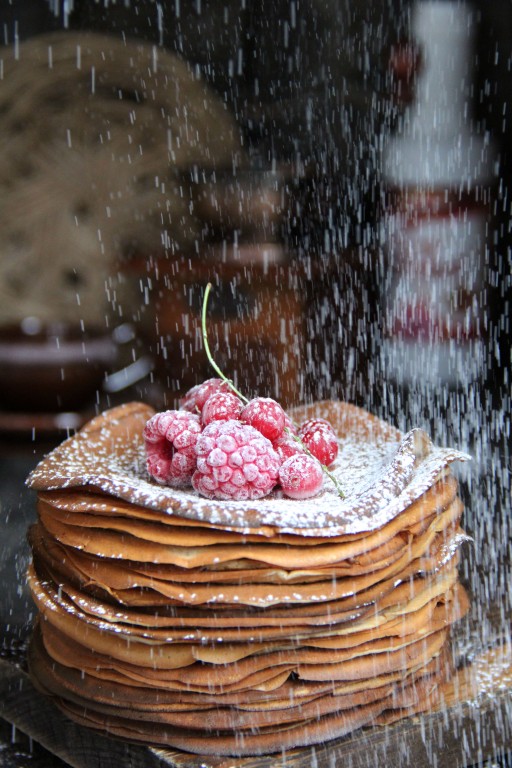 Кофейные блины, замешанные на молоке, получаются тонкими, нежными, к столу подаём их с чашечкой кофе или чая, дополнив сахарной пудрой, мёдом или вареньем.