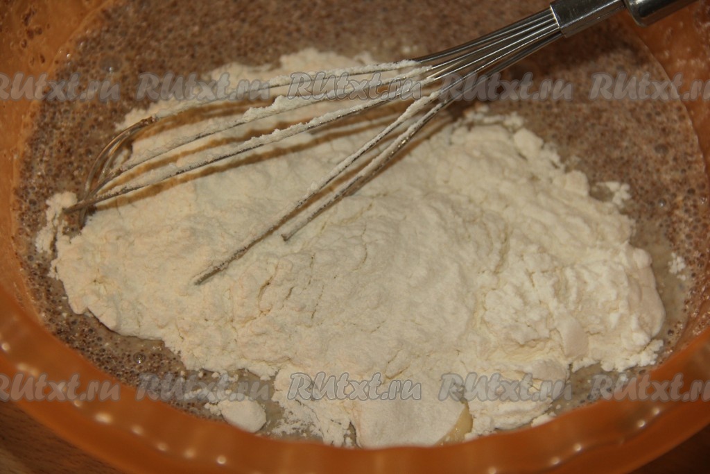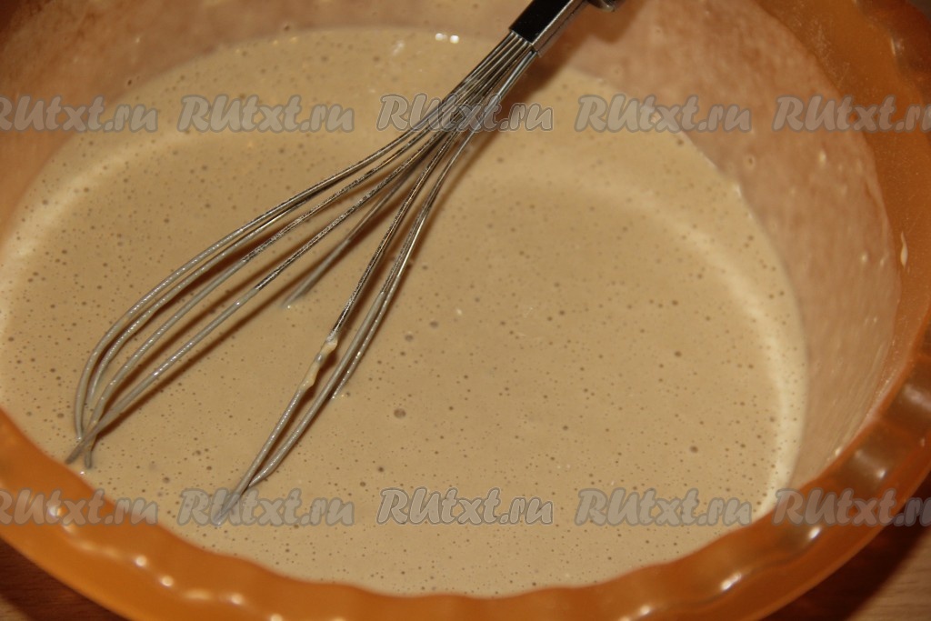 Частями добавляя оставшуюся муку и полностью вмешивая её, замесить негустое и очень ароматное кофейное тесто для приготовления блинов.