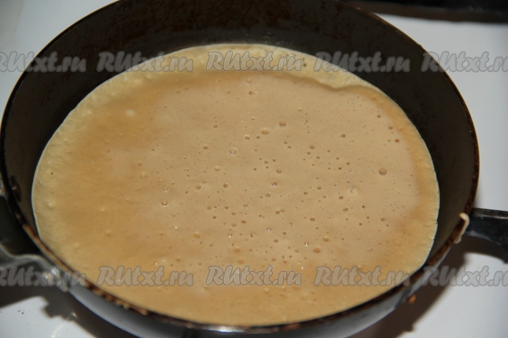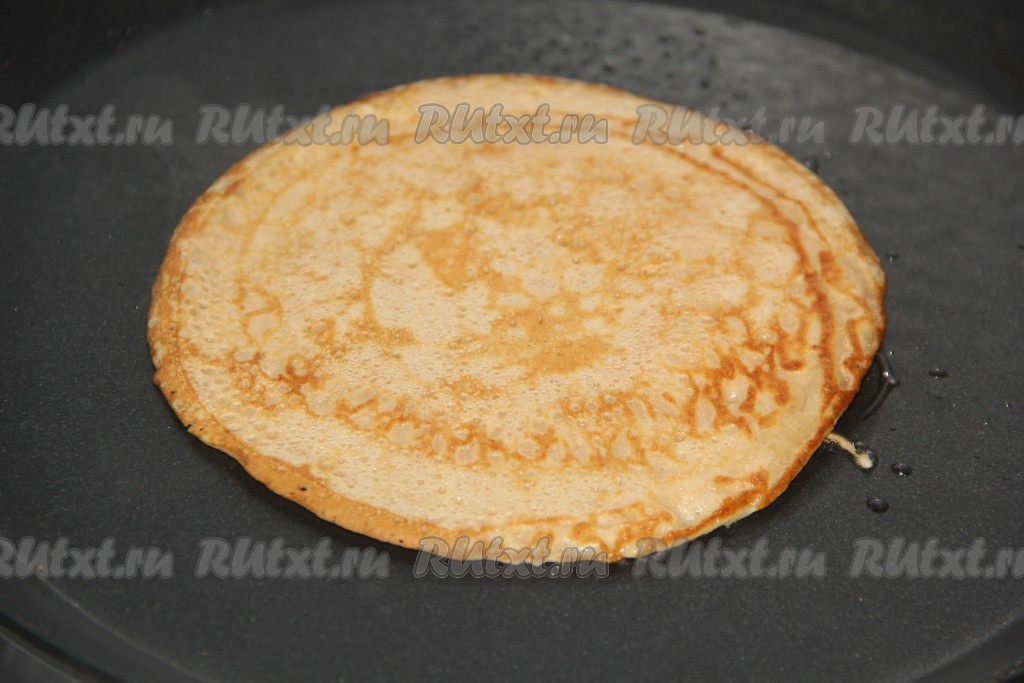 Хорошо раскалить сковороду, смазать растительным маслом, уменьшить огонь до среднего, налить половник кофейного теста и, равномерно его распределив, жарить блин до подрумянивания снизу.