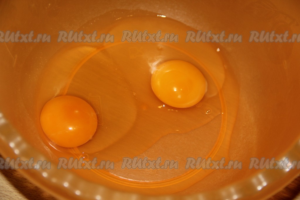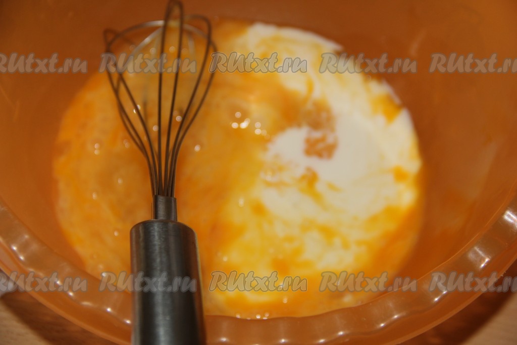 В миску с яичной смесью влить 350 миллилитров молока, перемешать.