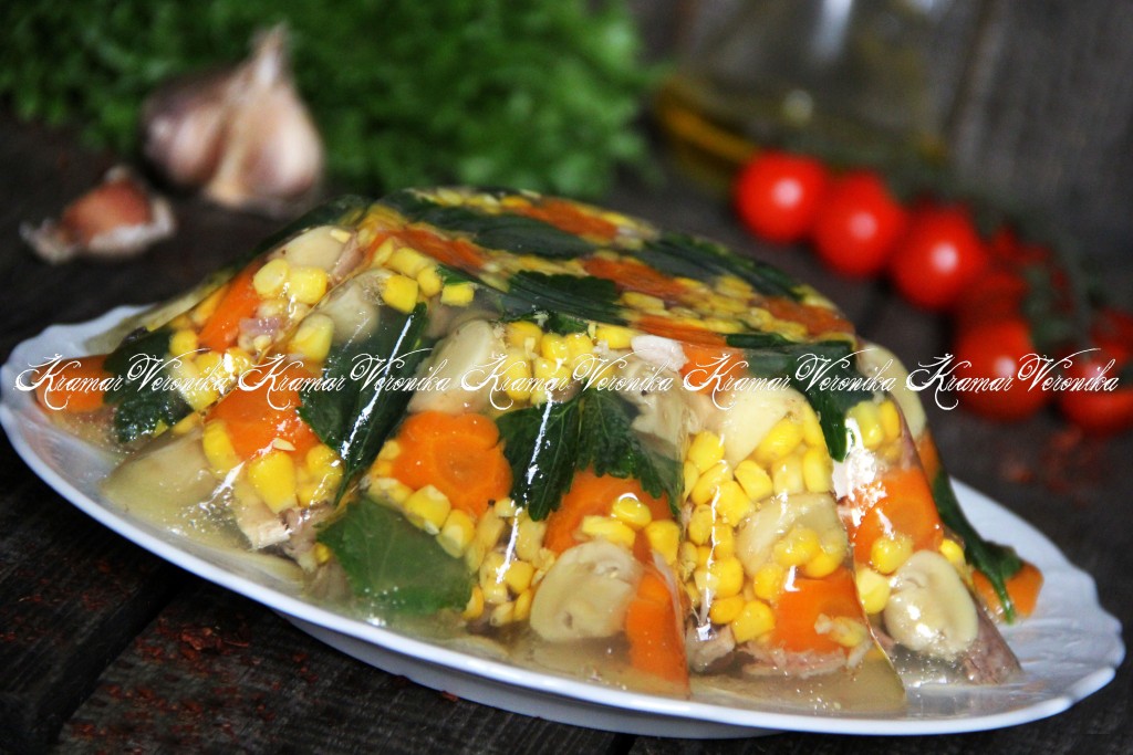 Заливное из курицы с овощами будет изумительно смотреться на праздничном столе, да и вкус его точно понравится многим. Заливное получается очень вкусным, красивым и ярким. Я готовила бульон в мультиварке, можно сварить курицу в кастрюле. В качестве дополнения к куриному мясу будем использовать морковь, кукурузу и маринованные шампиньоны. Заливное получается упругим и прозрачным, все ингредиенты идеально сочетаются между собой.