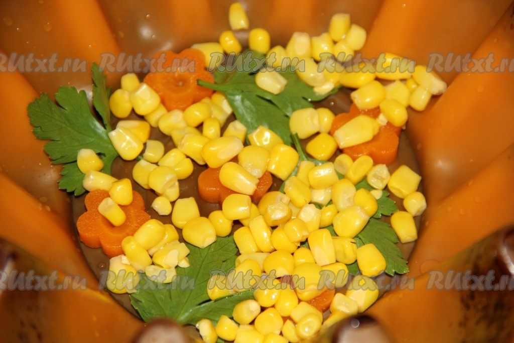 Затем выложить немного кукурузы.