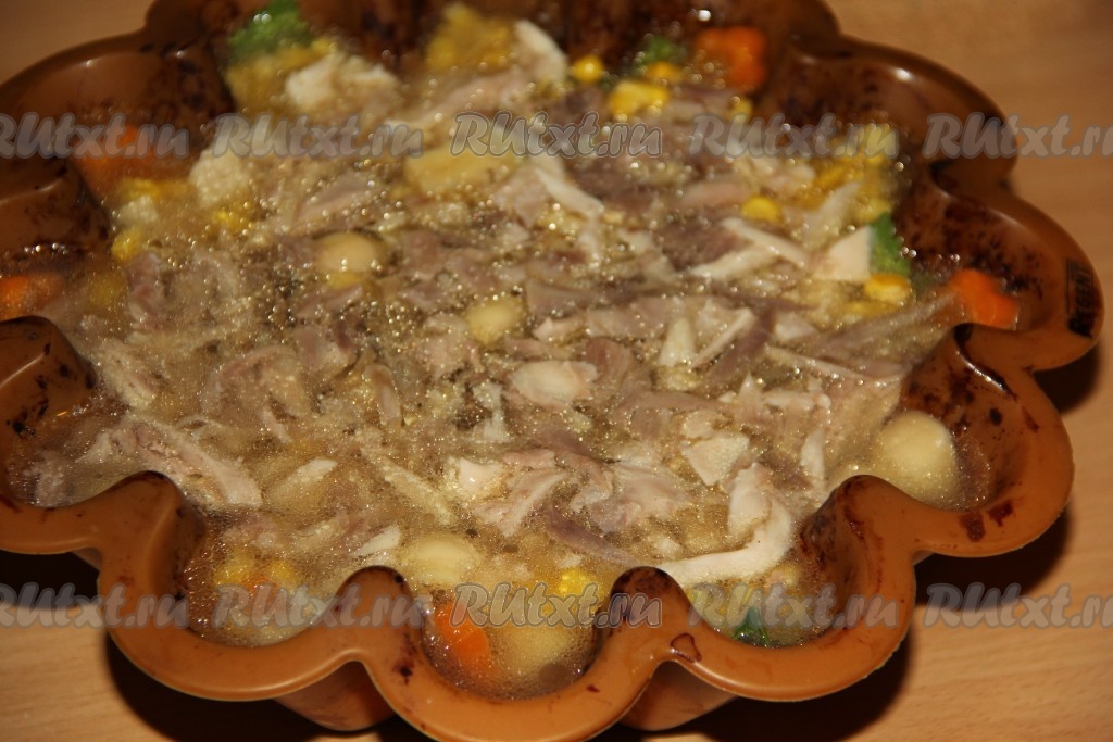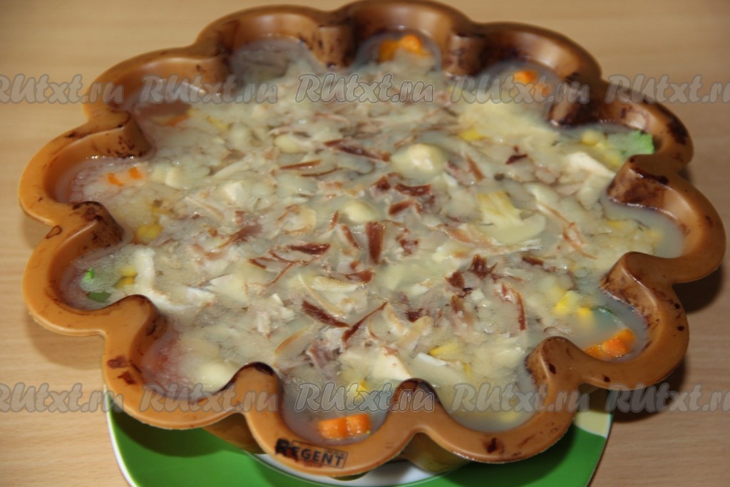 Поставить форму с заливным из курицы с овощами в холодильник на ночь (до полного застывания).