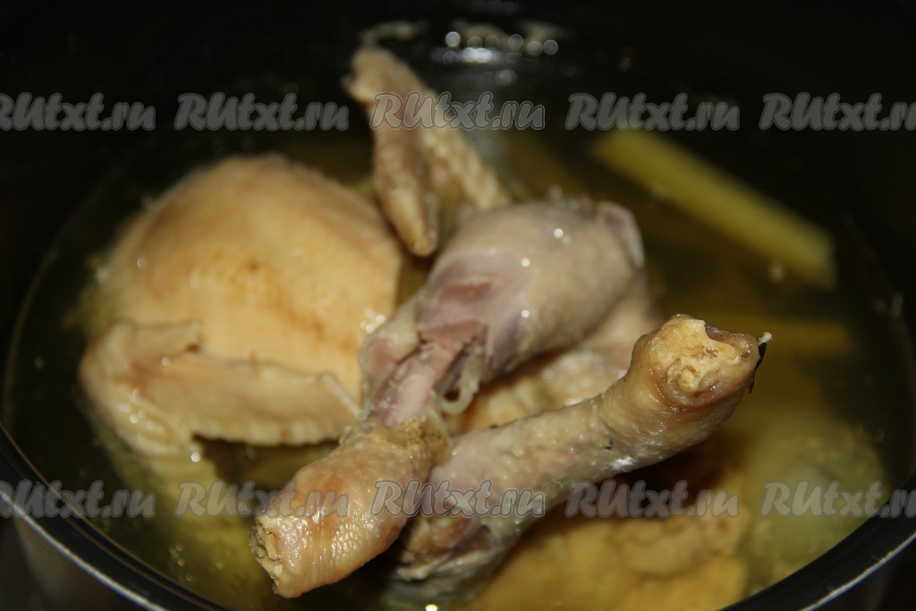 Курицу, сваренную в мультиварке (или кастрюле), оставить под закрытой крышкой в бульоне на 2-3 часа.