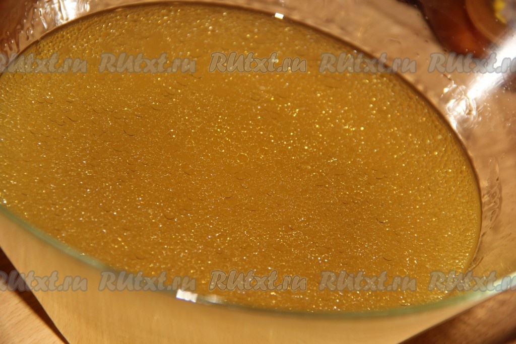 Прогреть желатиновую массу на среднем огне, помешивая, до полного растворения желатина (не кипятить!). В процеженный бульон добавить соль, выложить желатиновую массу, тщательно перемешать.