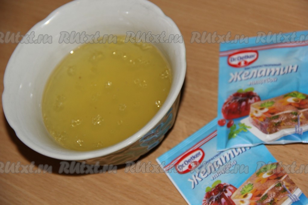 В 100 мл тёплого бульона развести желатин и оставить набухать на 20 минут.