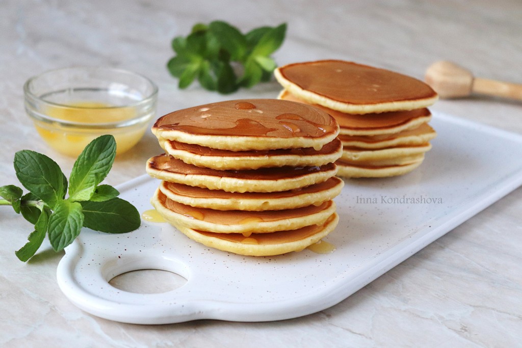 Панкейки - это американские оладьи небольших размеров. Чаще всего готовят их на завтрак и подают на стол с разнообразными добавками: мёдом, кленовым сиропом, вареньем, сгущённым молоком и т.п. Существует множество вариантов приготовления данной выпечки, я предлагаю самый простой и удачный. Панкейки, замешанные на сыворотке, получаются вкусными, пышными и аппетитными.
