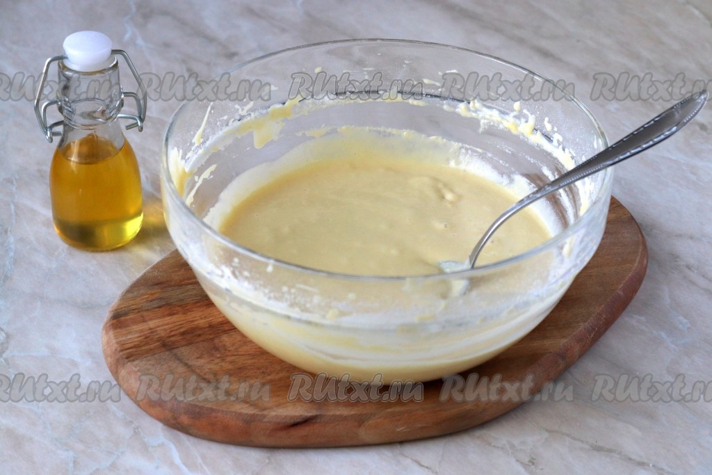 Перемешайте до однородного состояния. Тесто для панкейков не должно быть слишком густым, но и не таким жидким, как на блины.