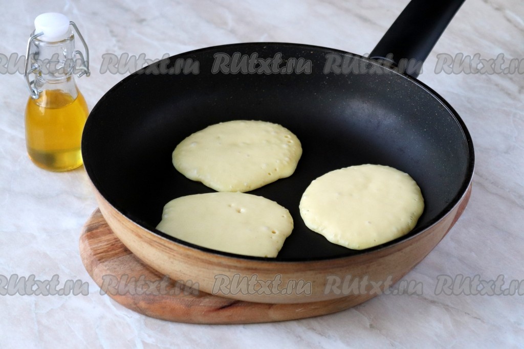 Сковороду с антипригарным покрытием отправьте на огонь и хорошо прогрейте. Масло добавлять не нужно. С помощью столовой ложки выложите тесто, формируя круглые оладьи желаемого диаметра.