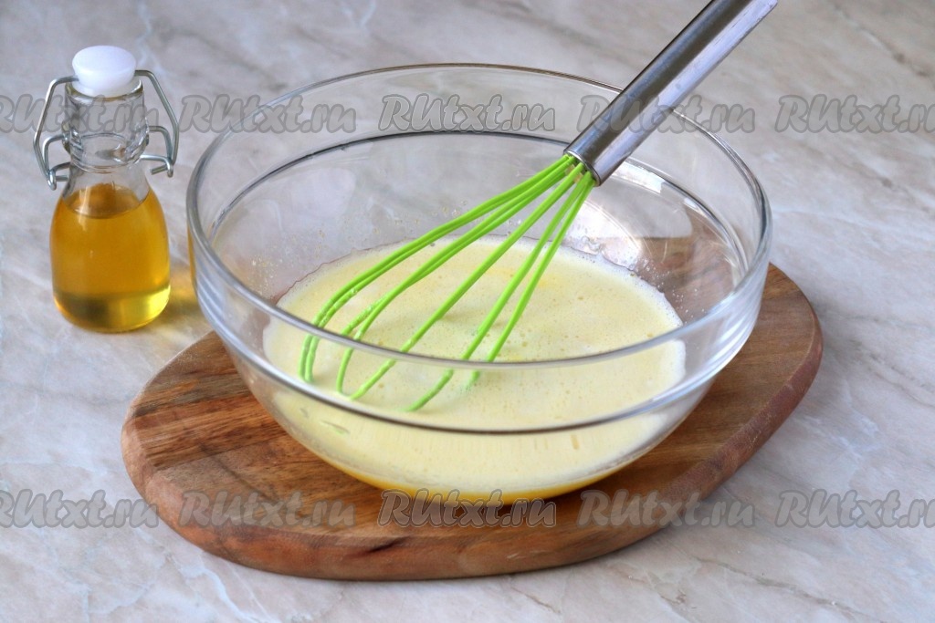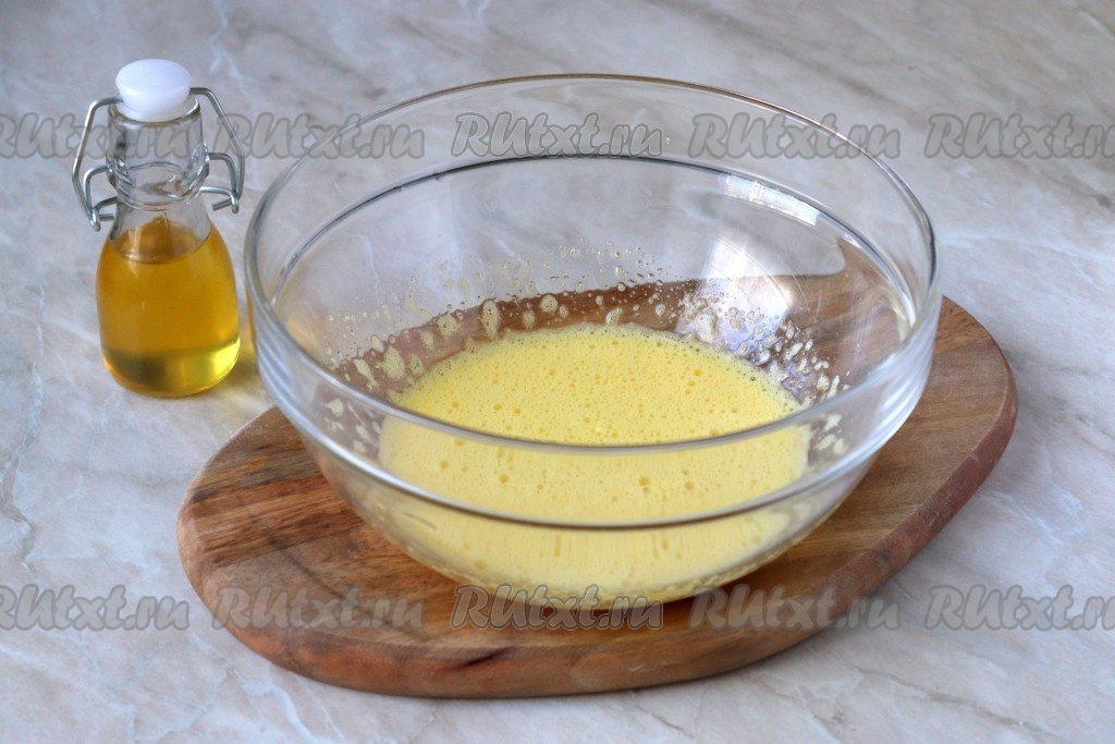 Затем влейте тёплую сыворотку (температура сыворотки, примерно, 40 градусов) и растительное масло, аккуратно перемешайте.