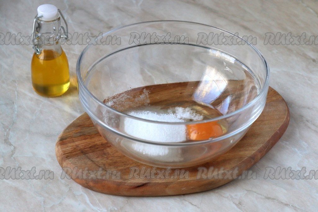 В глубокой миске соедините яйцо, щепотку соли и сахарный песок.