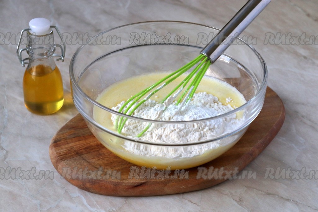 Добавьте просеянную пшеничную муку и разрыхлитель.