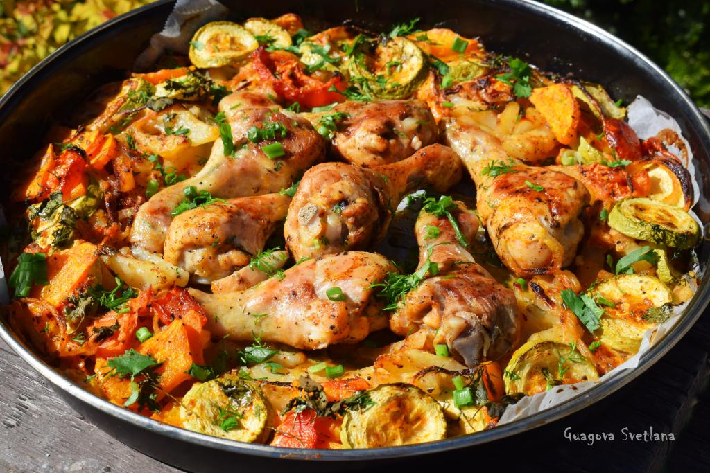 Куриные голени, запечённые с овощами в духовке, - это сытное, очень вкусное и красивое блюдо, которое вы без труда сможете приготовить для домашнего обеда или ужина. Процесс готовки несложный, так как основную работу за нас сделает духовка, к тому же мы сразу получим и мясо, и гарнир, что приятно сэкономит наше время на кухне. С овощами в рецепте можно экспериментировать, добавляя или убирая их по вкусу. Приготовьте это яркое, как внешне, так и по вкусовым ощущениям, блюдо, и, я думаю, оно вам очень понравится!
