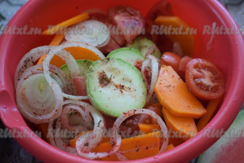 Отправляем кабачки, лук, тыкву, помидоры в глубокую миску, солим, перчим и добавляем специи по вкусу.