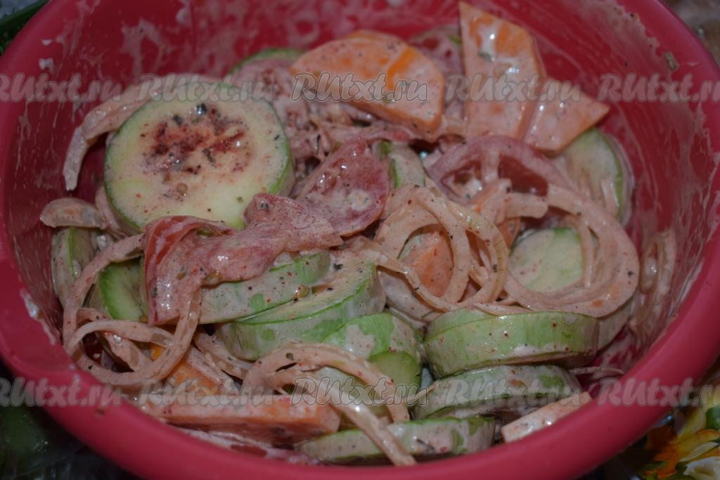 Перемешиваем овощи со специями, солью и майонезом, оставим постоять на 20 минут.