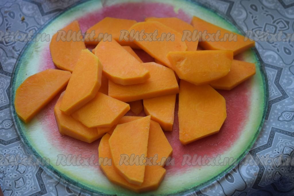 Очищенную тыкву нарежем на произвольные кусочки (я нарезала её на кружочки и затем кружки разделила пополам). Вместо тыквы можно взять морковь.