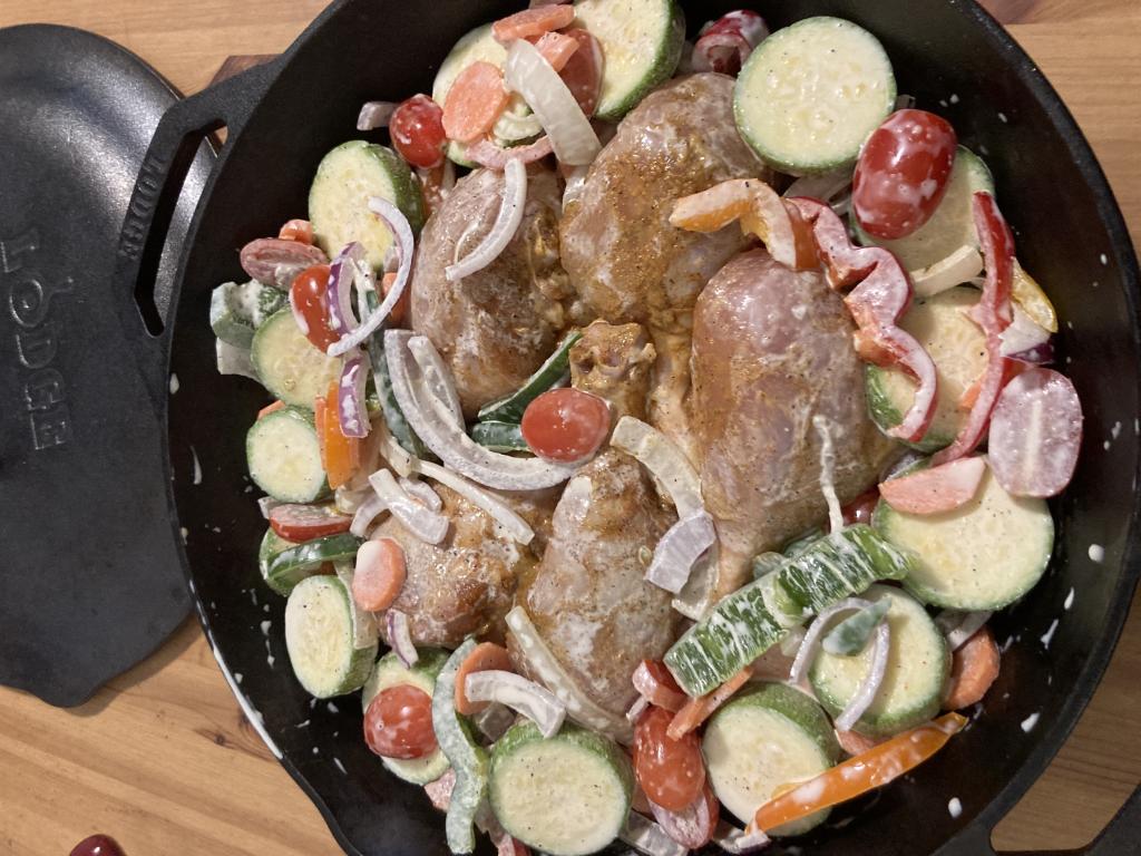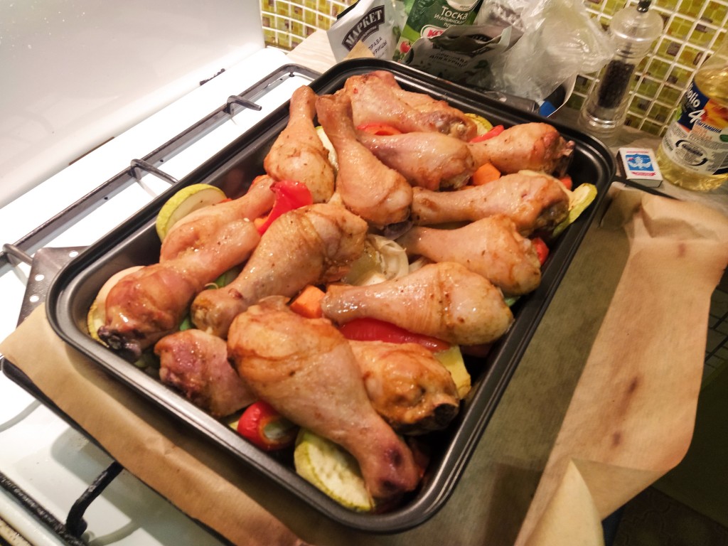 Отправляем форму с куриными ножками и овощами в разогретую духовку и запекаем 1 час 20 минут при температуре 190-200 градусов.