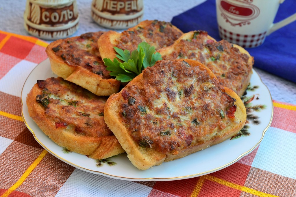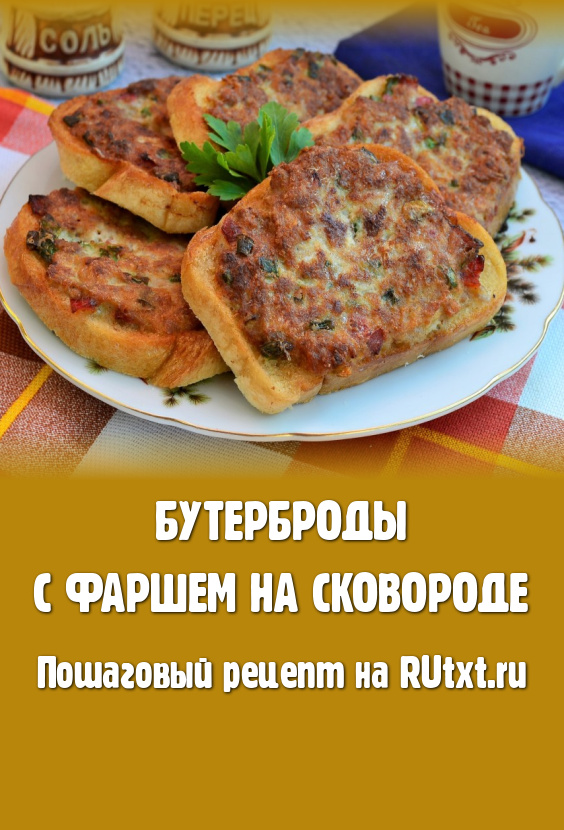 Жарить бутерброды только с одной стороны на небольшом огне до румяности фарша (минуты по 3-4). Готовые бутерброды выкладывать на тарелку.