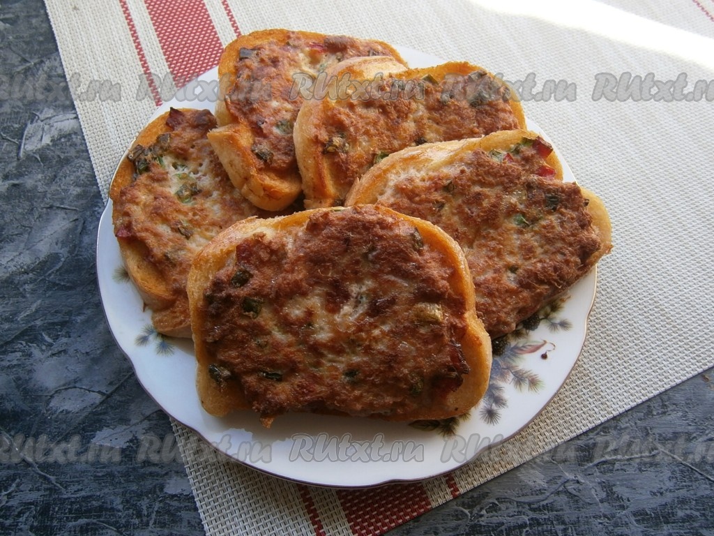 Смесь снова перемешать и выложить её не слишком толстым слоем на ломти батона, прижимая вилкой.