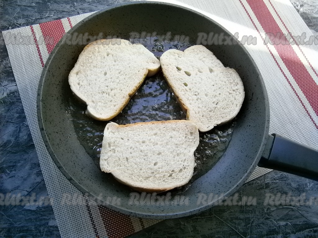 Растительное масло разогреть в сковороде и выложить бутерброды фаршем вниз.