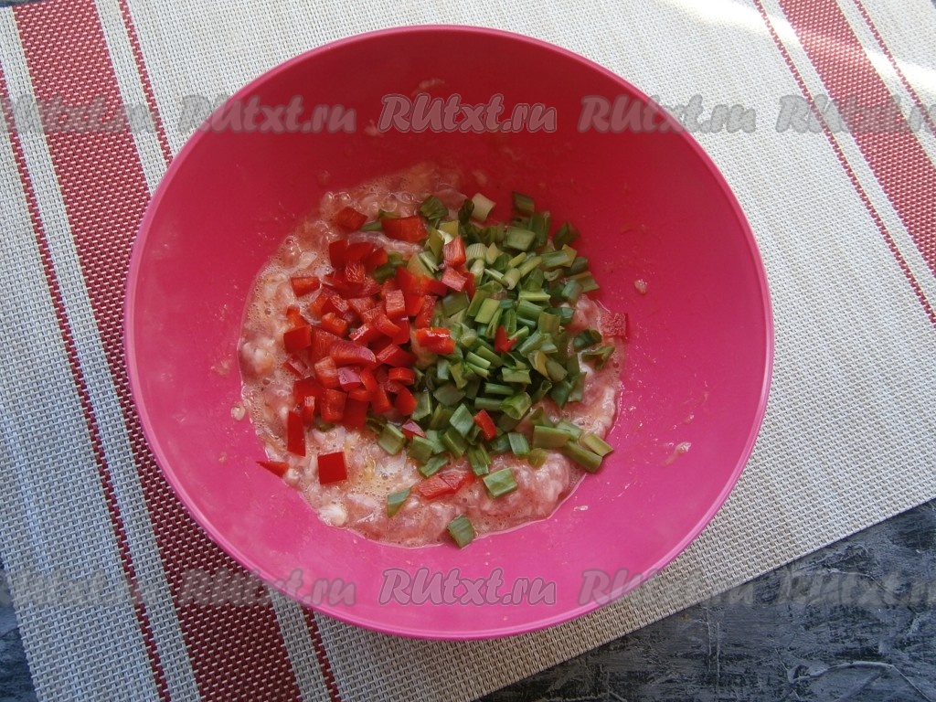 Хорошенько перемешать, добавить измельчённый зелёный лук и нарезанный небольшими кубиками сладкий перец (если нет болгарского перца, то смело готовьте без него).