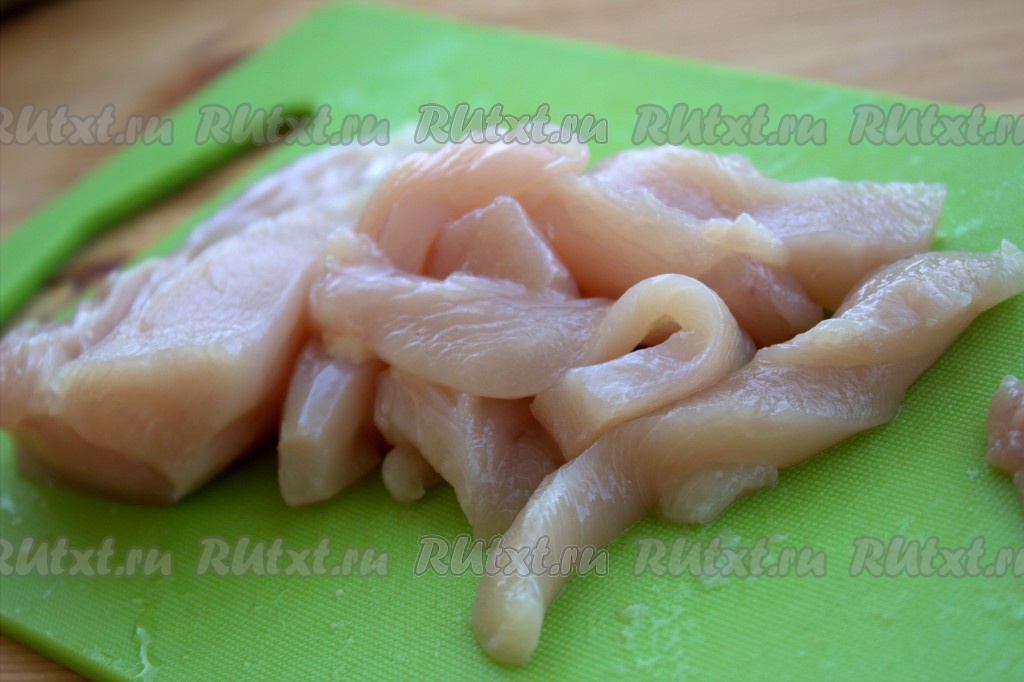 Куриную грудку вымыть, тоже нарезать на тонкие полоски.