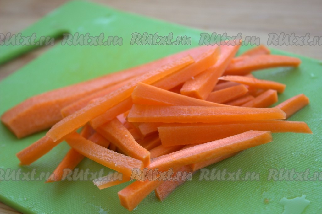 Болгарский перец вымыть, очистить от семян и перегородок, нарезать на тонкие полоски.