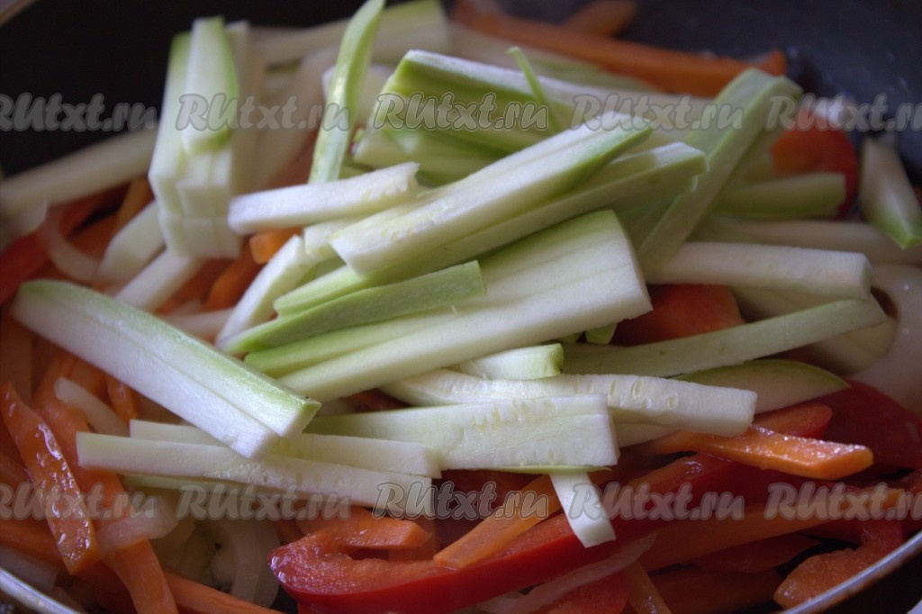 Овощи тщательно перемешать и сразу добавить нарезанный брусочками кабачок (если кабачок молодой, его можно готовить вместе с кожурой). Помешивая, обжарить овощи на среднем огне минуты 3-4, посолить и приправить специями по вкусу.