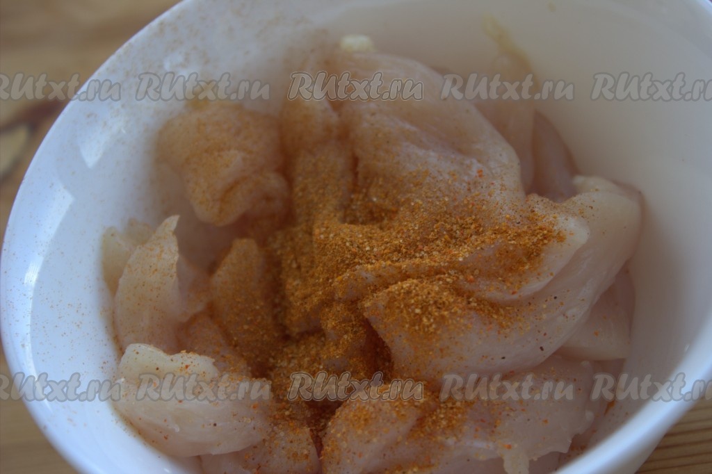 Поместить нарезанную куриную грудку в миску, немного посолить (мясо будет обжариваться с соевым соусом, а он достаточно солёный, поэтому много соли не добавляйте), добавить специи по вкусу (я добавила 0,5 чайной ложки универсальной приправы для курицы), очищенный и пропущенный через пресс чеснок (я посыпала гранулированным чесноком), хорошо перемешать.