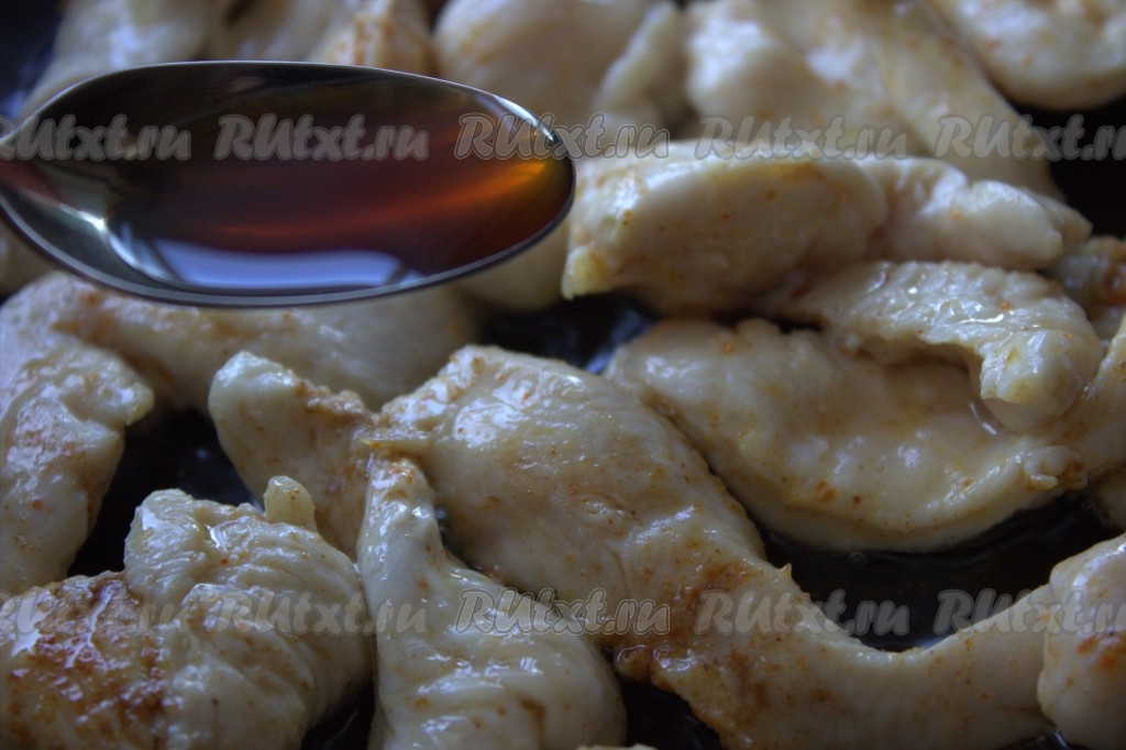 В сотейнике (или в сковороде с толстым дном) разогреть 1-2 столовые ложки растительного масла, выложить кусочки куриной грудки, влить соевый соус и обжарить мясо со всех сторон на среднем огне, помешивая, до готовности (примерно, 3-4 минуты). Мясо при разрезании должно быть без примесей крови, но при этом не должно быть пережаренным, чтобы грудка не получилась сухой.