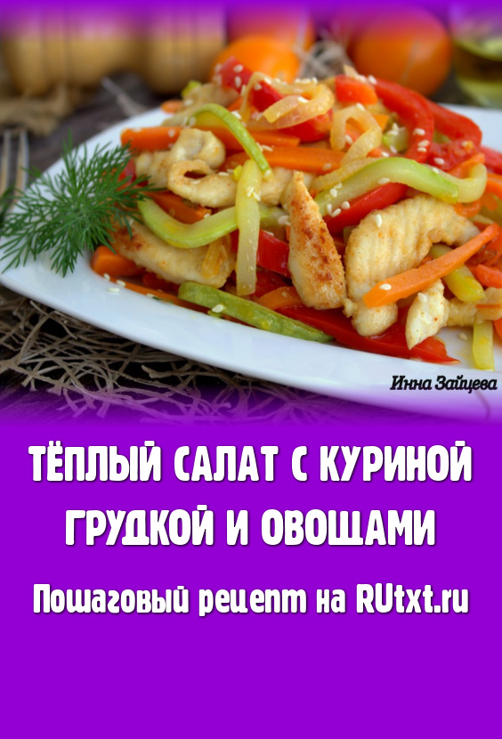 Вот таким ярким и аппетитным у нас получился тёплый салат с куриной грудкой и овощами. Очень вкусное и сытное блюдо, посыпав семенами кунжута, сразу подать к столу.
