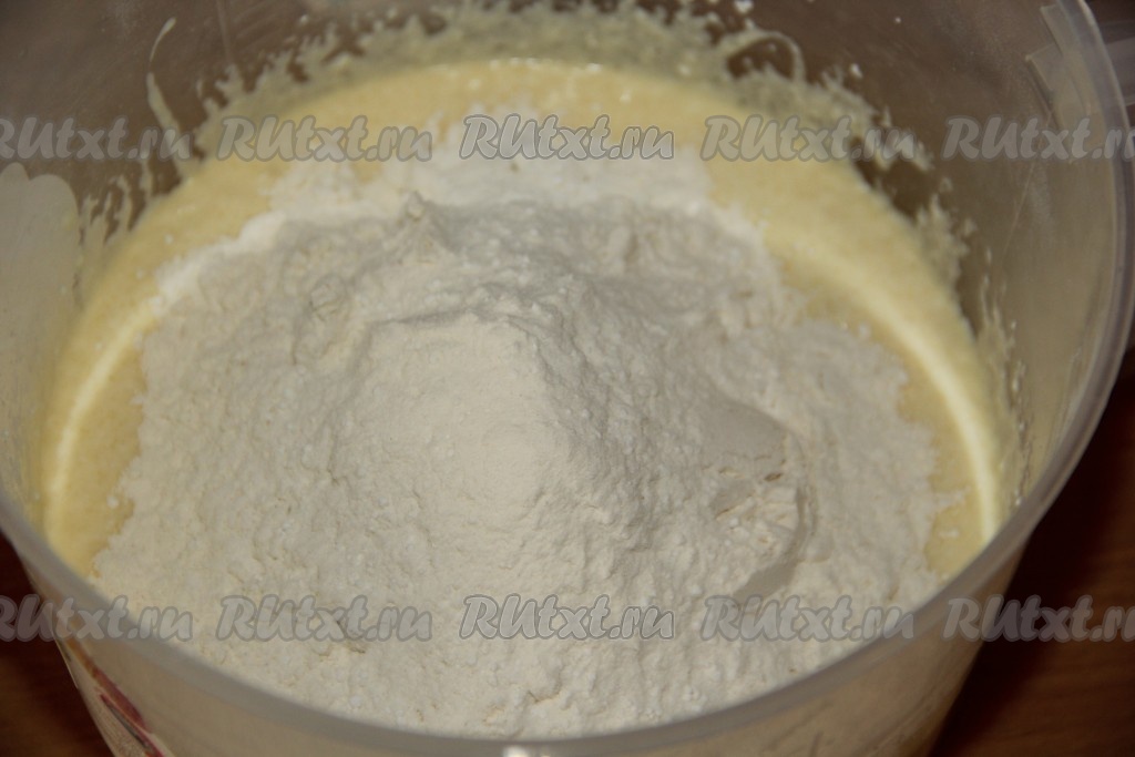 Погружным блендером пробить массу до однородности. Добавить 200 грамм просеянной муки, разрыхлитель, соль и ванилин.