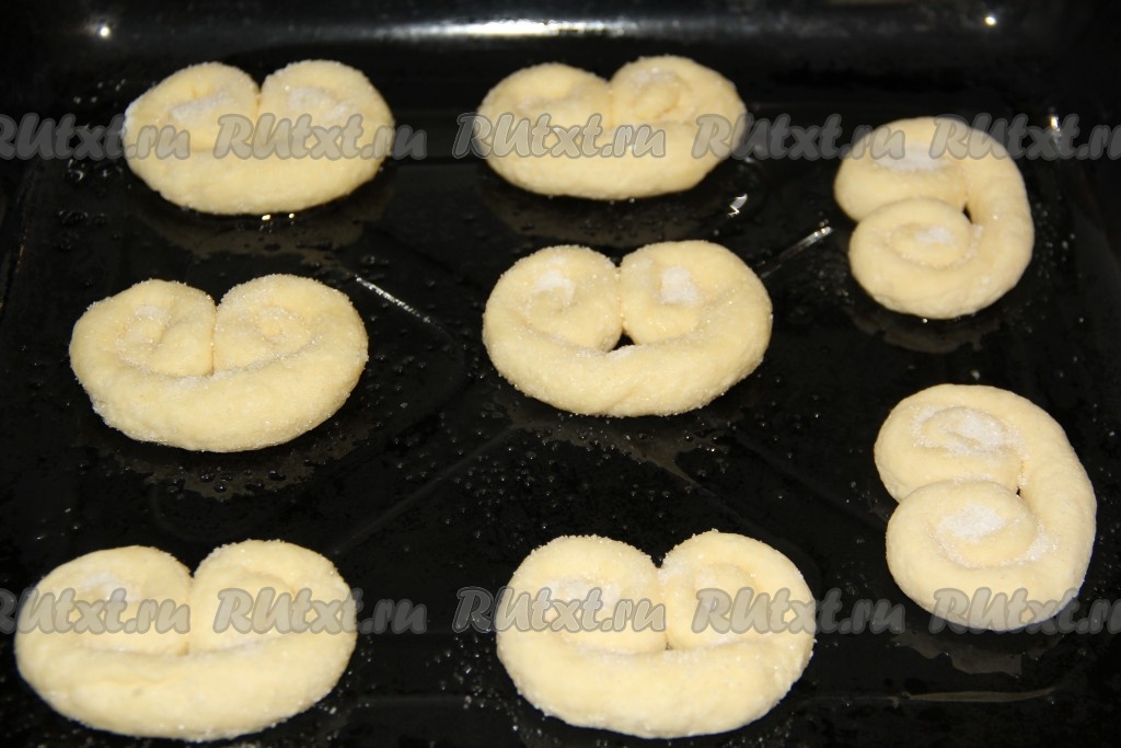 Аналогично сформировать и обвалять в сахарной смеси все крендельки, выложить их на противень, смазанный растительным маслом.