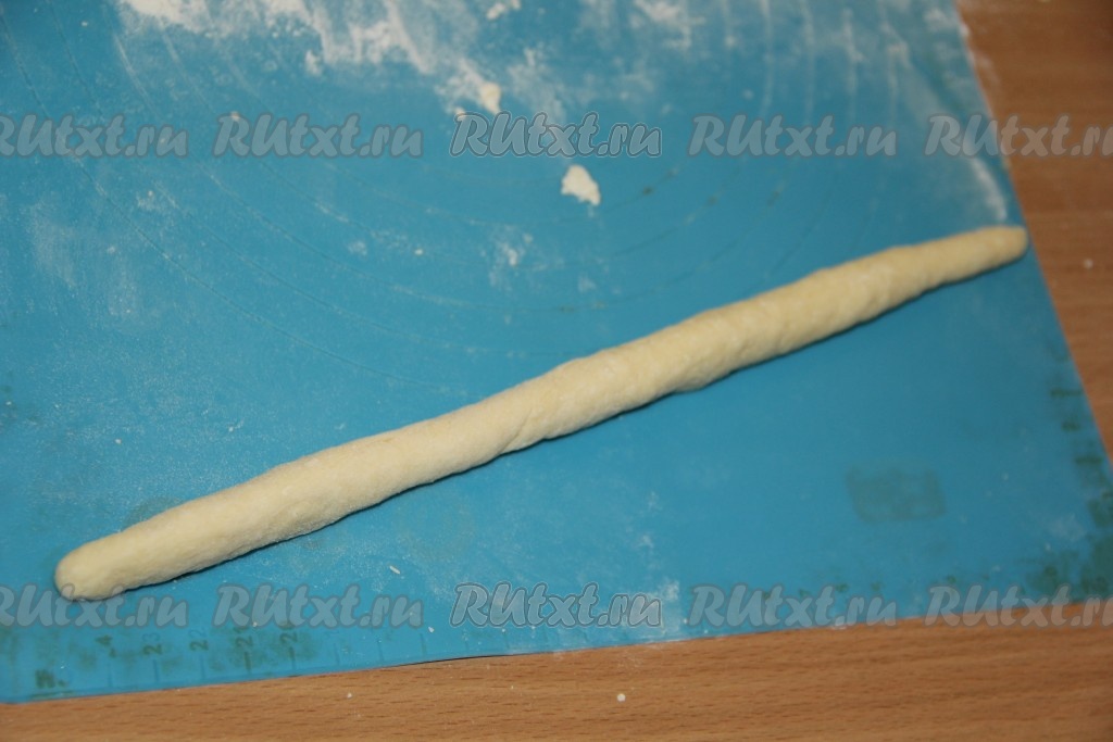 Отщипнуть от общей массы кусочек теста чуть больше грецкого ореха. Сформировать длинный жгутик.