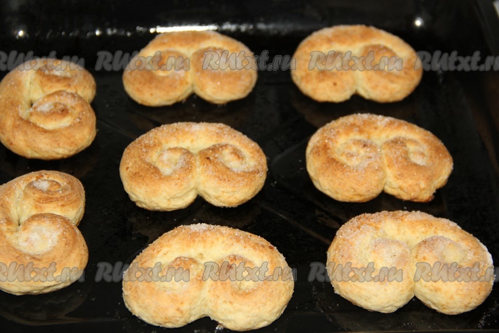 Выпекать крендельки из творожного теста в разогретой духовке, примерно, 10-15 минут (до лёгкого золотистого цвета) при температуре 200 градусов.